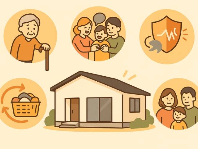 平屋は階段がなくワンフロア設計で バリアフリー、家事動線が短く効率的、家族全員が顔を合わせやすくコミュニケーションの取りやすさ、建物重量が軽く 耐震・台風対策に有利、そして核家族化が進む現代に合った ちょうどいい広さ。これら5つの要素が重なり合い、近年「平屋」を検討するご家族が急増しています。